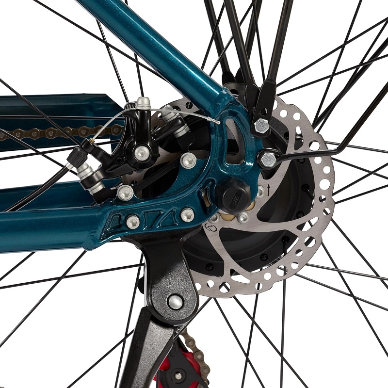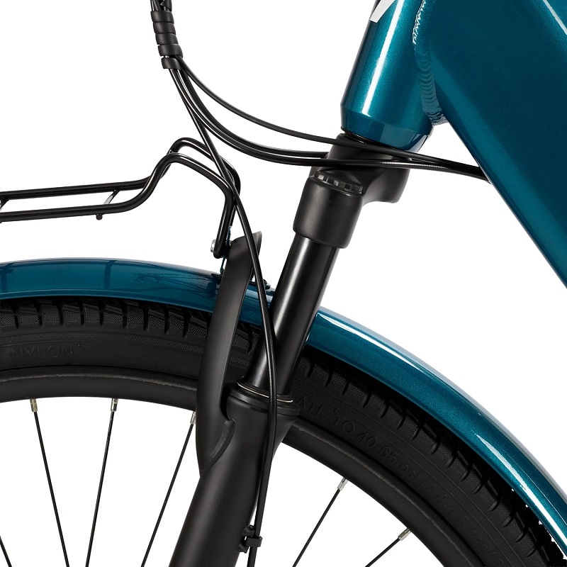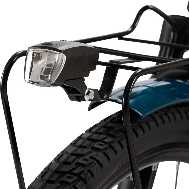 La bicicleta eléctrica con pedaleo asistido, perfecta para la ciudad, gracias a sus neumáticos de 28" x 1,75", luces LED y frenos de disco mecánicos delanteros y traseros.