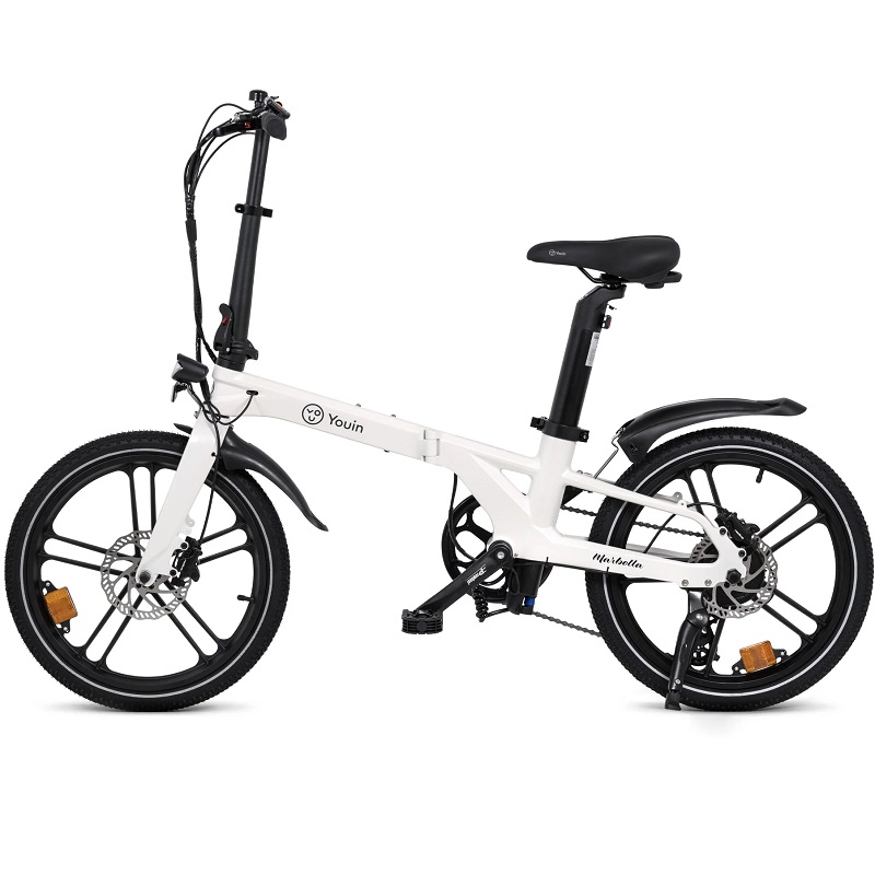 La bicicleta eléctrica Youin BK1350C MARBELLA está diseñada para una movilidad urbana práctica y eficiente, combinando funcionalidad y comodidad en un formato compacto. Este vehículo eléctrico se distingue especialmente por su diseño plegable, lo que facilita su transporte y almacenamiento en espacios reducidos, ideal para quienes buscan una solución versátil de movilidad urbana. Equipada con un motor de 250W, alcanza una velocidad máxima de 25 km/h, lo que garantiza desplazamientos rápidos y cómodos para los desplazamientos urbanos diarios.