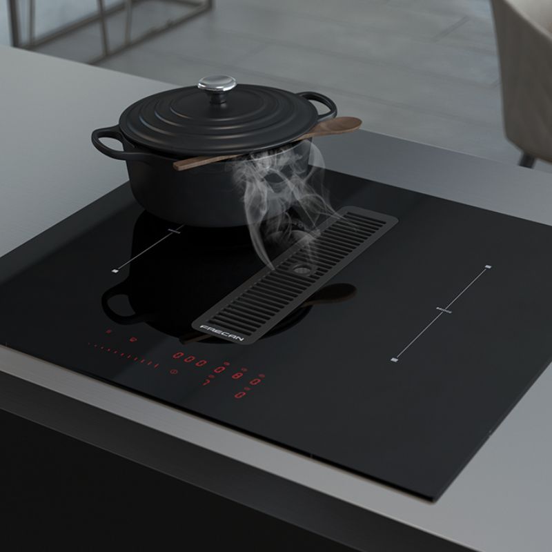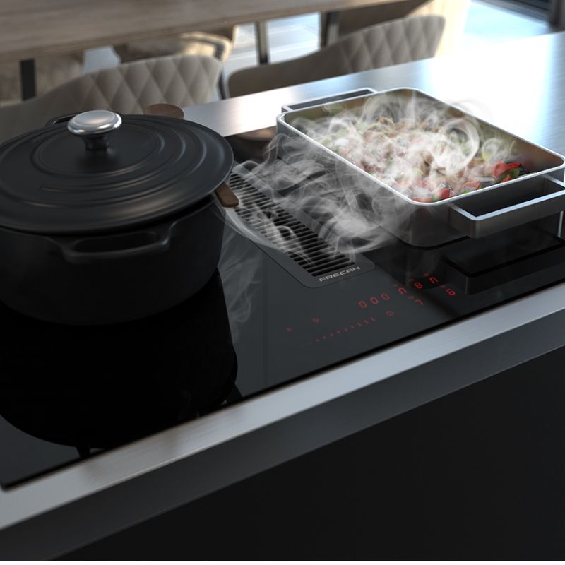 Nueva placa de inducción con sistema de extracción integrado, R-Evolution. Descubra una experiencia culinaria inigualable con la placa de inducción Flow 4.4 de 78 cm, equipada con un sistema de extracción integrado. Su elegante y vanguardista diseño genera un potente flujo de aire que elimina los olores indeseados. Seleccione rápidamente la temperatura y la potencia deseadas con un simple toque en la pantalla táctil. El mismo principio se aplica a la zona de extracción: simplemente seleccione la potencia deseada.