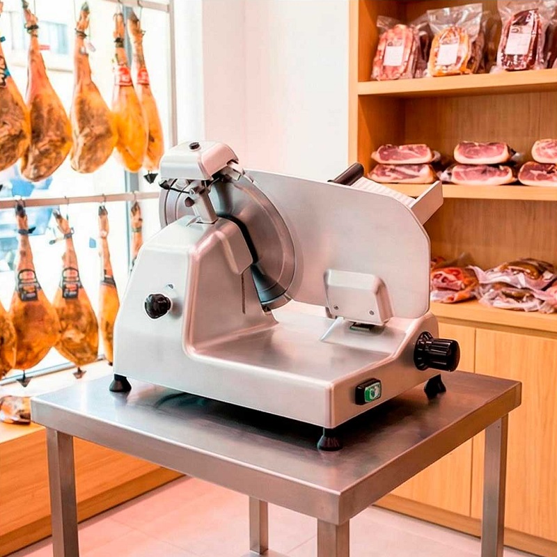 Rebanadora de charcutería con alimentación por gravedad, fabricada en aleación de aluminio anodizado.