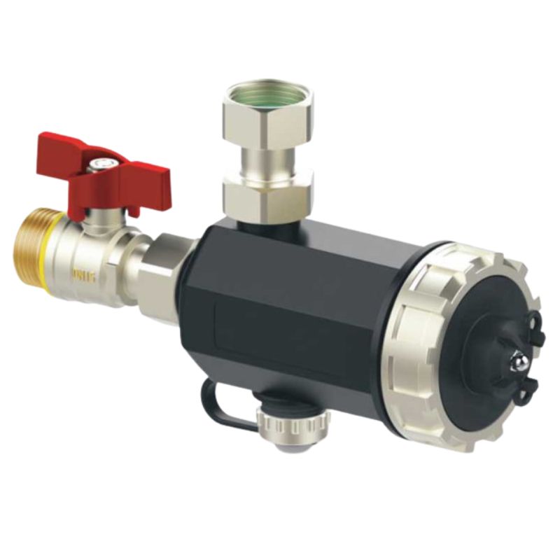 Compact thermoplastic drain cleaner with chrome-plated brass parts for heating systems, with a magnet for removing ferrous particles. It is the optimal solution for solving problems caused by the presence of particles, especially rust and sand, which form due to corrosion during normal system operation.