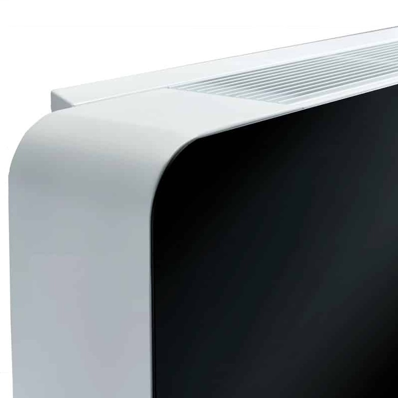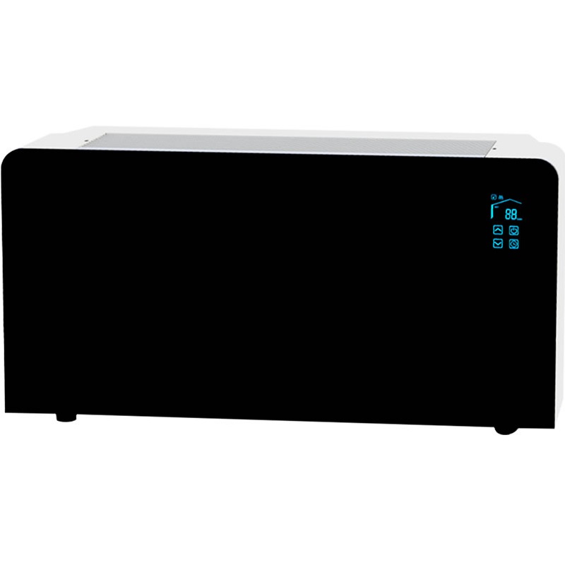 Deshumidificador de pared marca TRAU, modelo DHC100-NR. Diseño elegante y funcional, frontal de cristal táctil blanco. Serpentín evaporador y condensador con tratamiento epoxi para ambiente de piscina, arranque automático (reinicio solo en caso de corte de energía) Ventilador DC con 3 velocidades seleccionables.