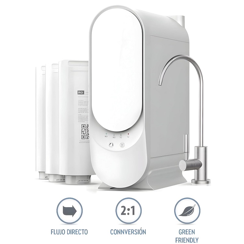Purificador de agua: El purificador de agua GALYON GENIUS D500 cuenta con un sistema de ósmosis inversa de 5 etapas. Produce de 1,5 a 1,7 litros por minuto y tiene una capacidad de filtración de 500 galones por día (GPD) con una tasa de rechazo de sal superior al 90 %.