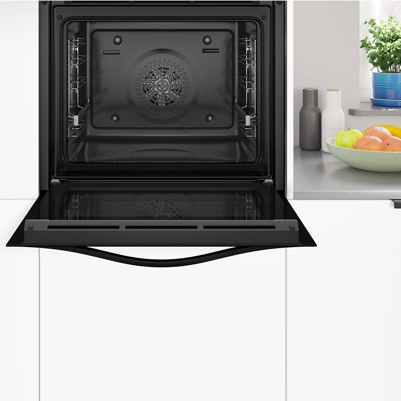 La tecnología de convección asistida por ventilador garantiza una distribución uniforme del calor para obtener resultados consistentes en todos los niveles. Con una capacidad de 71 litros, la cavidad única permite preparar fácilmente comidas familiares. El horno empotrable de 59,5 × 59,4 × 55 cm se adapta a armarios altos estándar y otros muebles, con una profundidad de instalación de 55 cm para una colocación directa. La guía telescópica facilita la introducción y extracción de los platos, minimizando el riesgo de contacto con superficies calientes. La iluminación interior mejora la visibilidad durante la cocción y evita abrir la puerta innecesariamente.