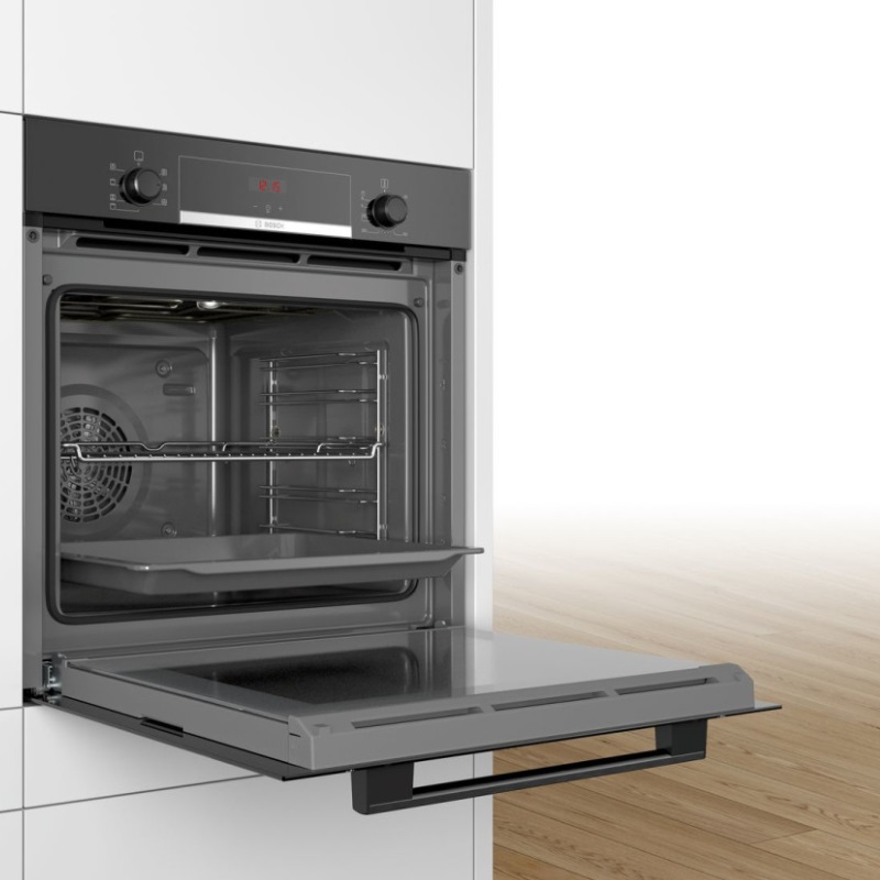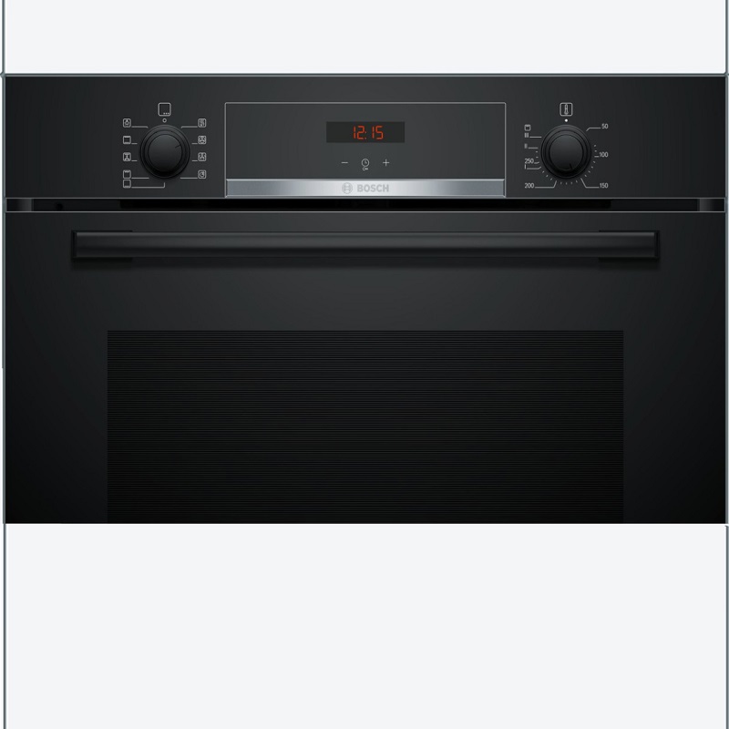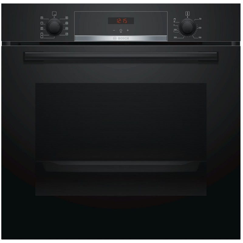 Horno Bosch Serie 4 HBA534BB0. Tamaño: Mediano, Tipo: Eléctrico, Capacidad interior total: 71 L. Instalación: Integrable, Color: Negro, Control: Giratorio y táctil. Tipo de reloj: Electrónico, Tipo de temporizador: Digital. Clase de eficiencia energética: A, Consumo energético (calor convencional): 0,97 kWh, Consumo energético (ventilador): 0,81 kWh
