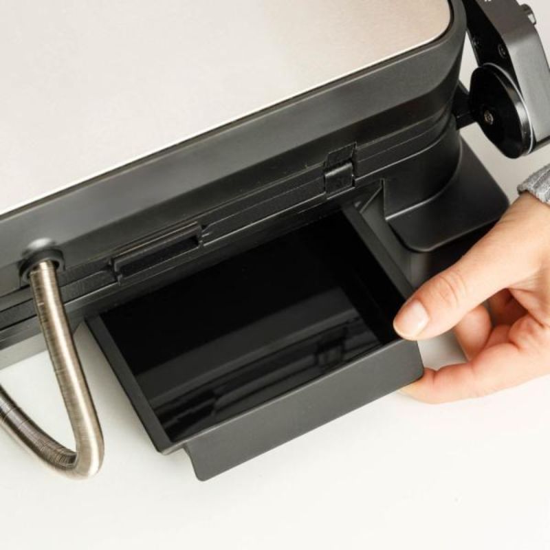Bandeja recogegrasas extraíble: Para una cocción más limpia y saludable al eliminar el exceso de grasa. Protección térmica de seguridad: Evita el sobrecalentamiento y garantiza un uso seguro. Bloqueo de placa para almacenamiento vertical: Ocupa muy poco espacio y se guarda fácilmente en cualquier armario o encimera.