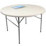 Mesa plegable rectangular, con estructura de acero y tablero de plástico blanco, con asa de transporte y cierre de seguridad resistente a la intemperie.