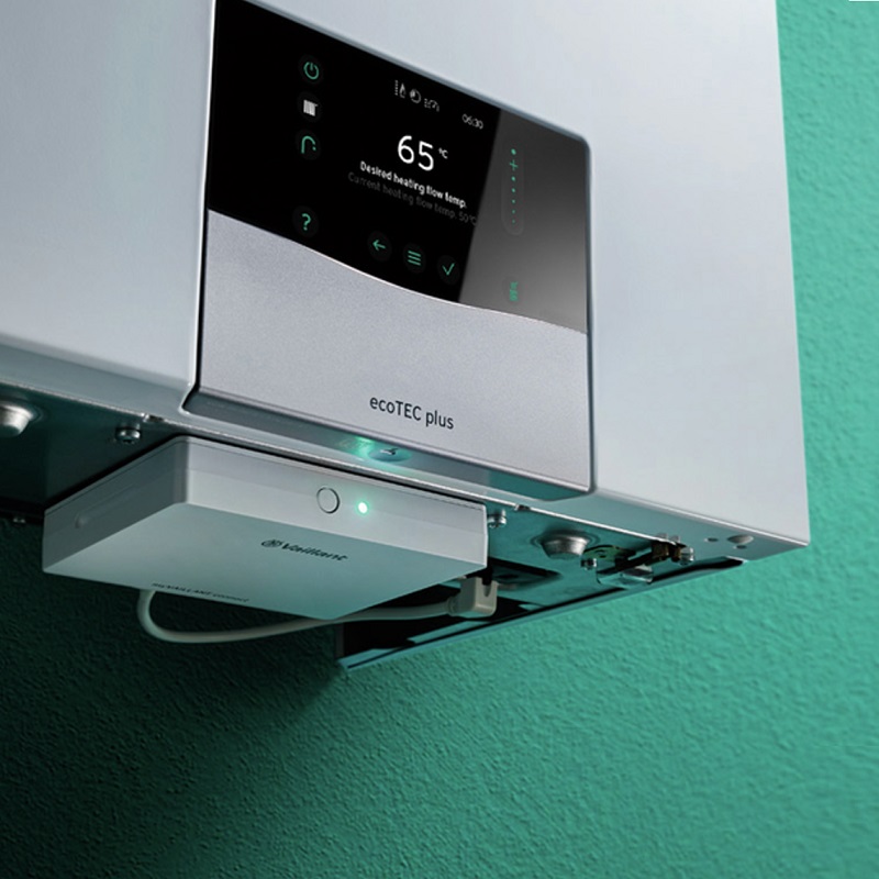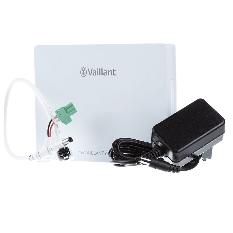 Pasarela de internet Vaillant con conexiones para su instalación con bombas de calor y calderas Vaillant fabricadas a partir de 2005. Para su instalación con sistemas sensoROOM, sensoCOMFORT, sensoHOME o sensoROOM pure, permite a sus clientes controlar su calefacción y agua caliente sanitaria a través de la app myVAILLANT.