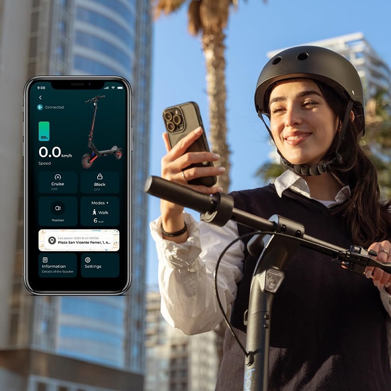 Este patinete eléctrico cuenta con una potencia máxima de 800 W y está equipado con ruedas de 10 pulgadas, capaces de subir cuestas y circular por todo tipo de superficies. Ofrece una autonomía de hasta 40 km y cumple con la nueva normativa de circulación española. Se conecta mediante una aplicación móvil.
