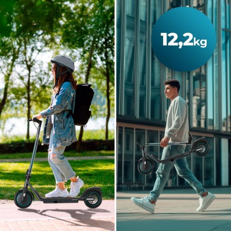 Ultraligero y fácil de manejar. Con un peso de tan solo 12,2 kg, es fácil de transportar y guardar. Supera obstáculos con facilidad. Ruedas robustas y duraderas diseñadas para una comodidad óptima en todos los trayectos, independientemente del estado de la carretera.