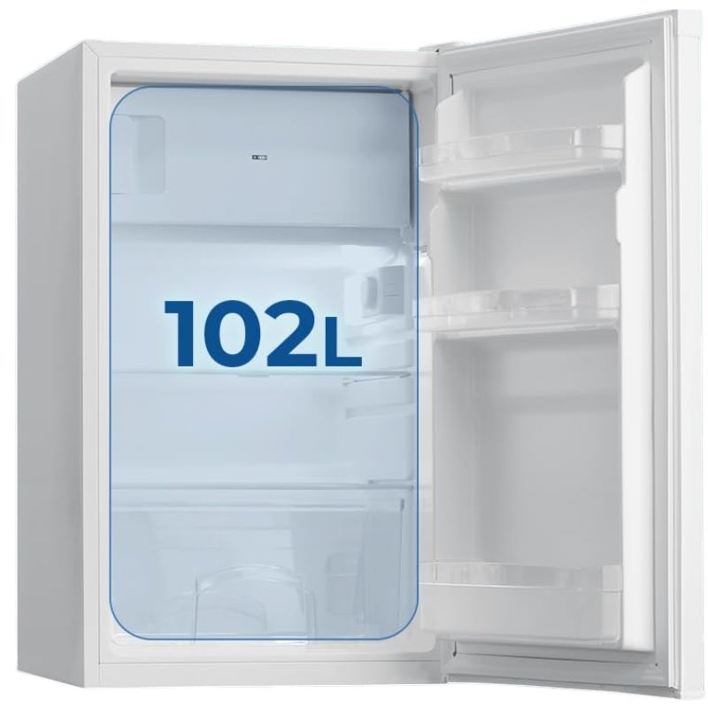 Este refrigerador cuenta con tecnología de enfriamiento cíclico, un compresor universal y refrigerante R600a. Cuenta con un diseño de clase energética E y un nivel de ruido máximo de 40 dB. Su diseño en blanco incluye una puerta reversible de fácil apertura e iluminación interior LED. Ofrece controles manuales, descongelación manual y funciones optimizadas para un máximo rendimiento. Su capacidad total es de 102 litros, con un congelador de 4 estrellas y múltiples estantes para un almacenamiento óptimo.