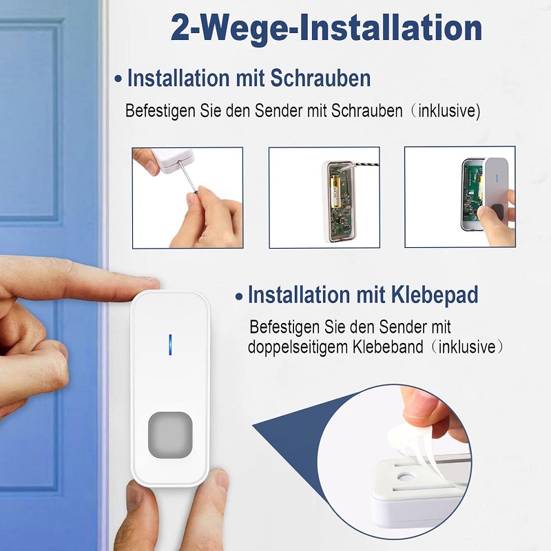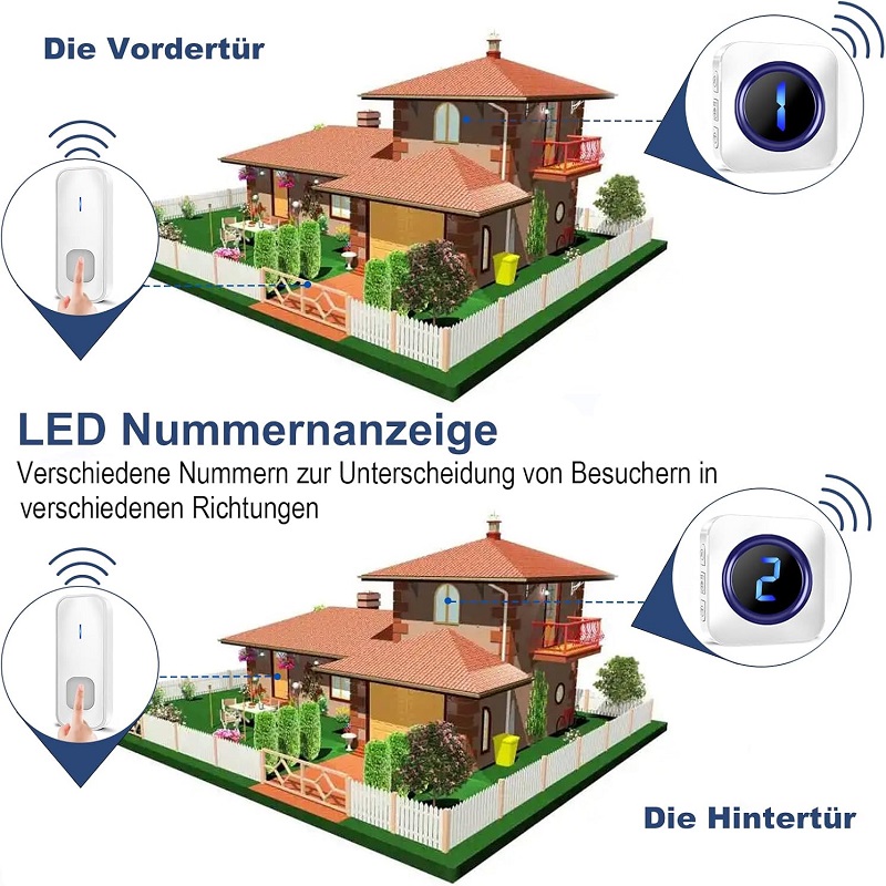 Simplemente conecte el receptor del timbre a una toma de corriente y fije el botón del timbre a la pared exterior o al marco de la puerta con los tornillos o la almohadilla adhesiva incluidos. Puede instalarlo en cualquier lugar de su hogar: cocina, jardín, oficina, tienda, buzón, etc. Hemos diseñado el timbre tradicional no solo inalámbrico, sino también inteligente. El indicador LED puede mostrar diferentes números para identificar fácilmente la puerta abierta. Está diseñado para personas sordas y mayores.