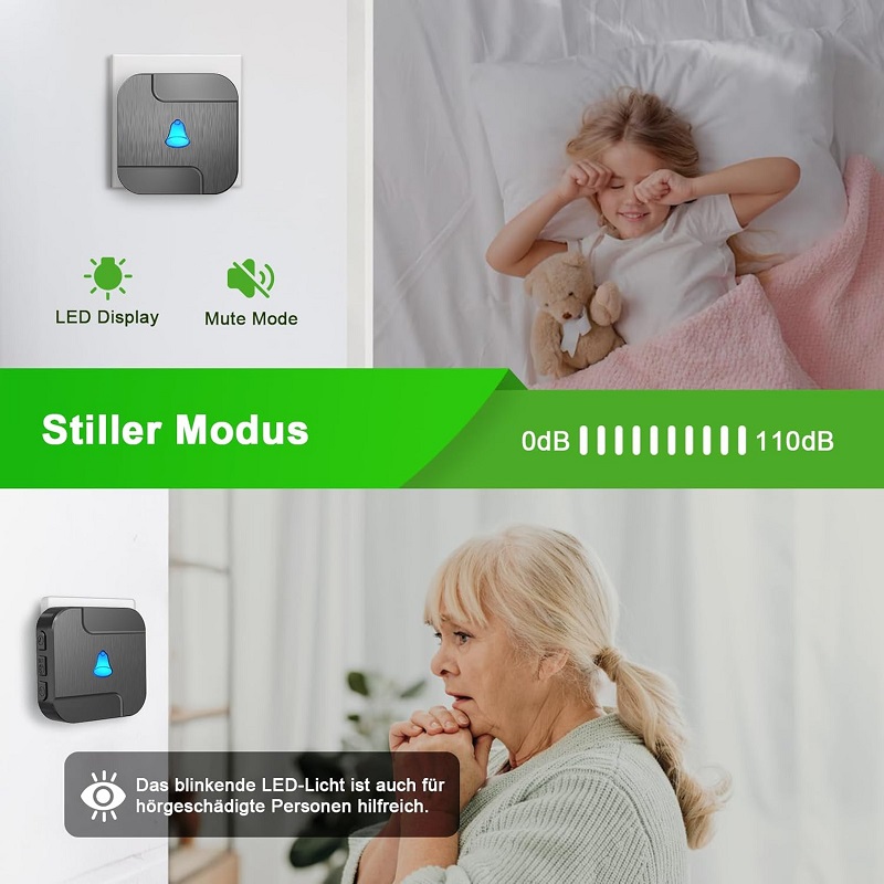 Sonido personalizado, modos flexibles: Disfrute de un control preciso con 5 niveles de volumen de hasta 110 dB, ideal para personas con discapacidad auditiva o personas mayores. Cambie fácilmente del modo solo LED al modo LED y elija entre 55 melodías para alertas personalizadas. Tus últimos ajustes se guardan para una comodidad óptima.