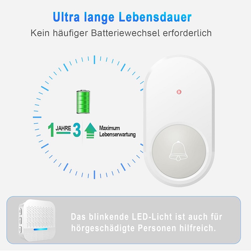 Señal potente en cualquier lugar: Nuestro timbre ofrece un alcance de 300 metros en espacios abiertos, lo que le permite estar siempre en contacto. Ya sea en el jardín, en el piso de arriba o incluso en el sótano, no vuelva a perderse ninguna visita.