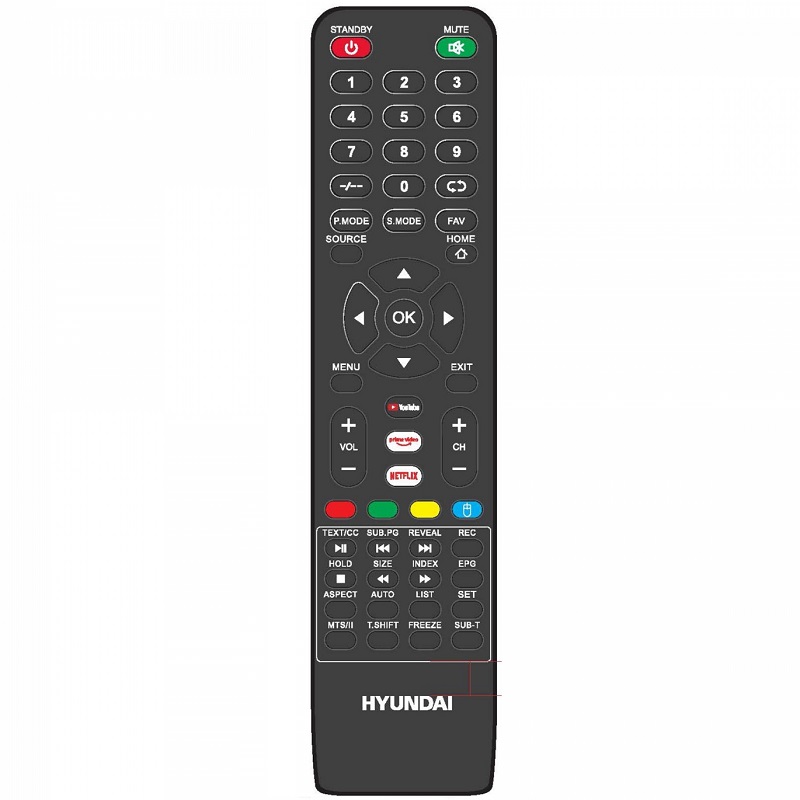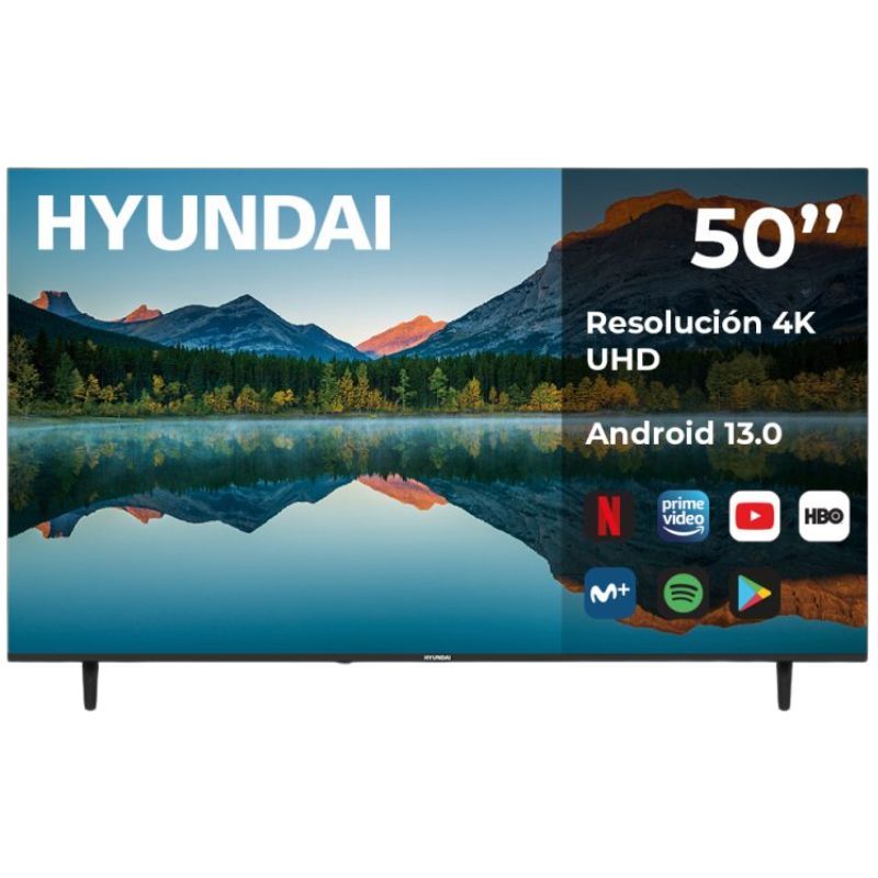 Smart TV Hyundai, modelo HTV5000UA. Pantalla TFT de 50 pulgadas, calidad de imagen Ultra HD y clase energética E. Android TV versión 13.0 y compatible con sintonizador DVB-S2/T2. Diseño en color negro con soporte. Mando a distancia con acceso directo a aplicaciones seleccionadas. Incluye funciones como Modo Hotel, reproducción USB, conectividad Miracast y acceso completo a Google Play Store. Puertos HDMI 1.4 y USB 2.0. Resolución: 4K UHD