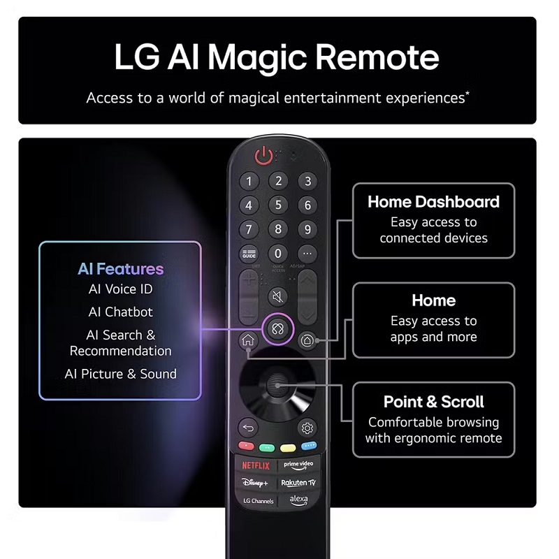 Personalización avanzada: reconocimiento de voz, recomendaciones de contenido, ajustes inteligentes de imagen y sonido, asistente virtual inteligente y Magic Remote con puntero inalámbrico.