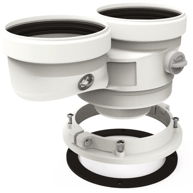 Adaptador coaxial para salidas de caldera de doble flujo, compatible con calderas Biasi, Cointra, Fagor, Ferroli, Manauld, Remeha, Sime y Tifel. Fabricado en polipropileno con juntas.