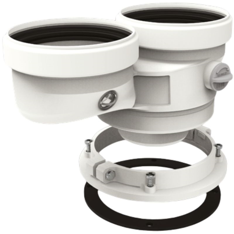 Adaptador coaxial para salidas de caldera de doble flujo, compatible con calderas Domusa, Fondital y Wolf. Fabricada en polipropileno con juntas. Incorpora tomas de aire y humos en cada lado.