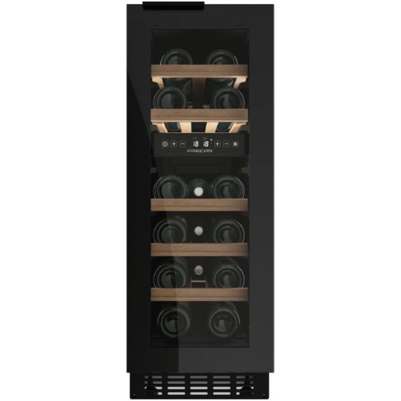La vinoteca integrable Frecan, de tan solo 30 cm de ancho y con capacidad para 16 botellas, es perfecta para espacios reducidos. Cuenta con dos zonas de temperatura independientes, ideales para vinos blancos y tintos, y se controla fácilmente mediante un panel táctil. Su iluminación LED regulable de 3000 K aporta un toque de elegancia a la vez que protege las botellas. Un diseño compacto y moderno que se integra a la perfección en cualquier cocina.