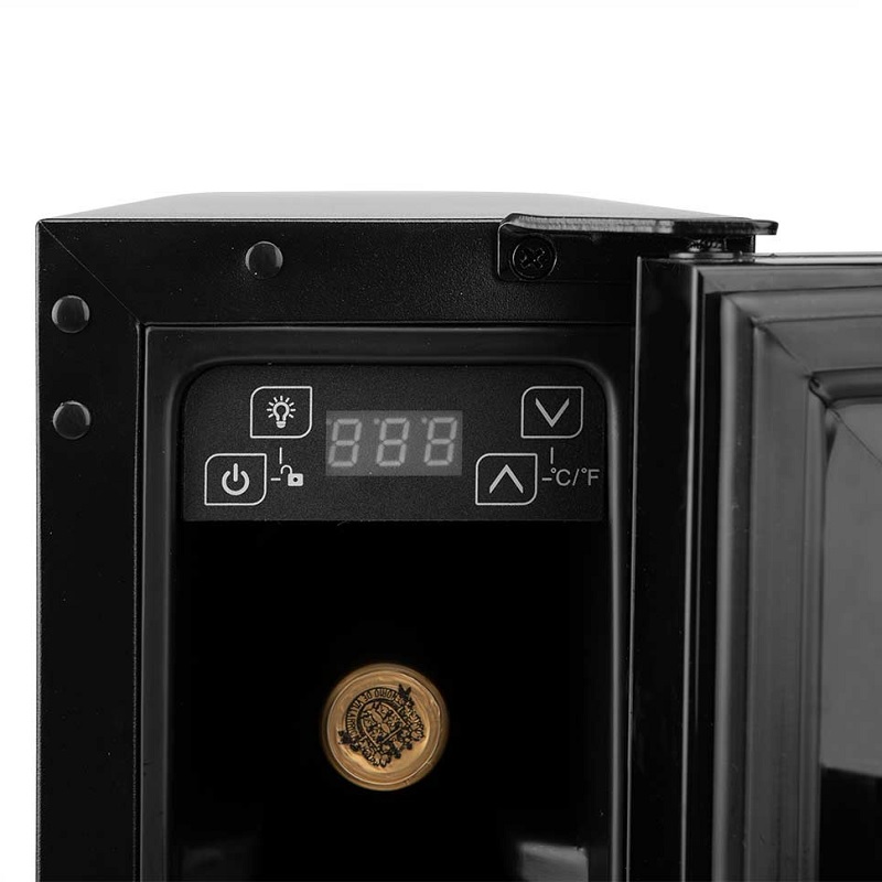 El sistema de refrigeración del compresor garantiza una refrigeración rápida y estable, manteniendo una temperatura constante. Gracias a la pantalla LCD numérica y al panel de control táctil, permite regular la temperatura entre 5 °C y 20 °C, adaptándose a vinos tintos, blancos o espumosos. Además, el ajuste de temperatura en °C o °F ofrece comodidad y precisión.